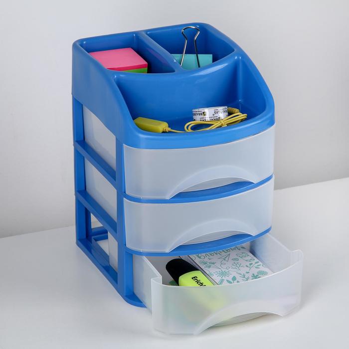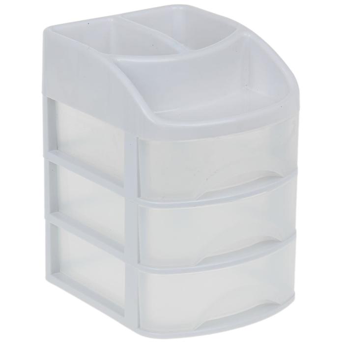 The plastic piece of furniture is designed to store trifles, accessories for sewing, creativity and other accessories. The product is equipped with drawers with handles.