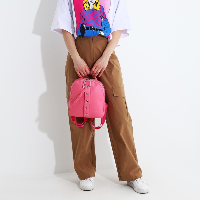 A backpack with a zipper, 4 external pockets, pink color
