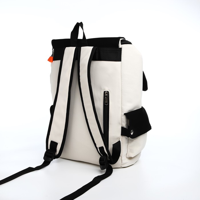 A backpack with a zipper, 5 outer pockets, beige color/black