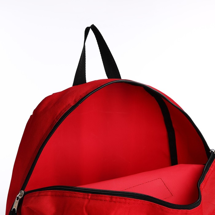 A backpack with a zipper, external pocket, red color
