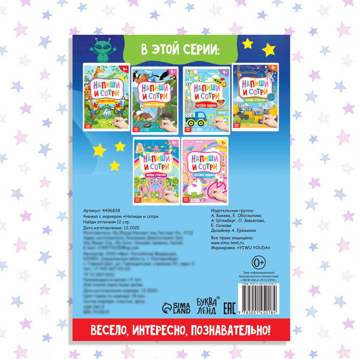 in the book of 12 pages. They are made of paper, the marker is made of plastic. The publication is recommended for children over 4 years old.