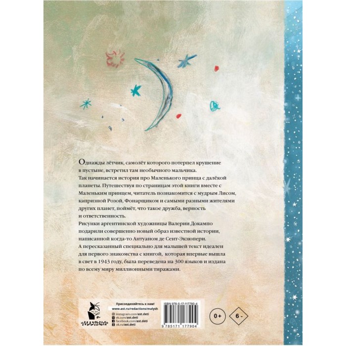Once a pilot whose plane crashed in the desert, met an unusual boy there. Thus begins the story about the little prince with a distant planet. Traveling along the pages of this book, along with the little prince, the reader will meet a wise fox, capricious rose, lantern and a variety of residents of other planets, will understand what friendship, fidelity and responsibility are. A completely new image of a famous story written once by Antoine de Saint-Exupery. And the text retold specifically for babies is ideal for the first acquaintance with the book, which was first published in 1943, was translated into 300 languages and published around the world with millions of circulations. >