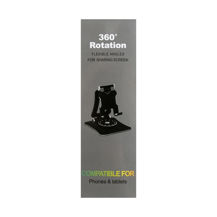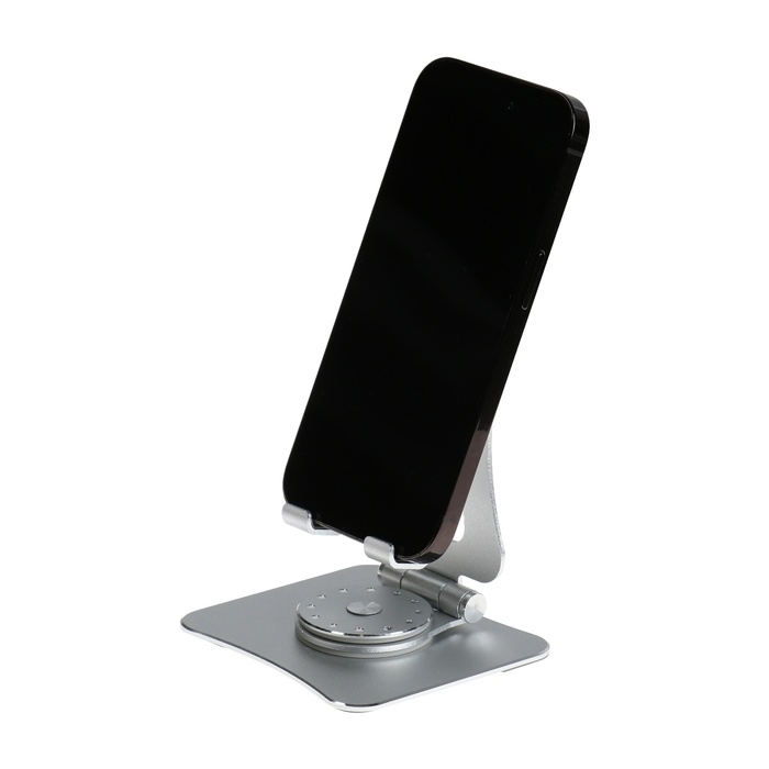 A phone stand, adjustable, folding, 360 ° rotation, metal, silver