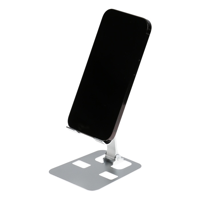 A phone stand, adjustable, folding, metal, rubber inserts, silver