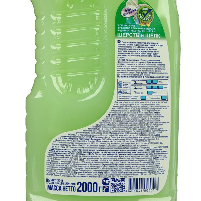 A special tool for washing wool and delicate fabrics in water of any rigidity. “Help” for washing wool and delicate fabrics contains special protection, which softens the fibers and protects them from rolling.