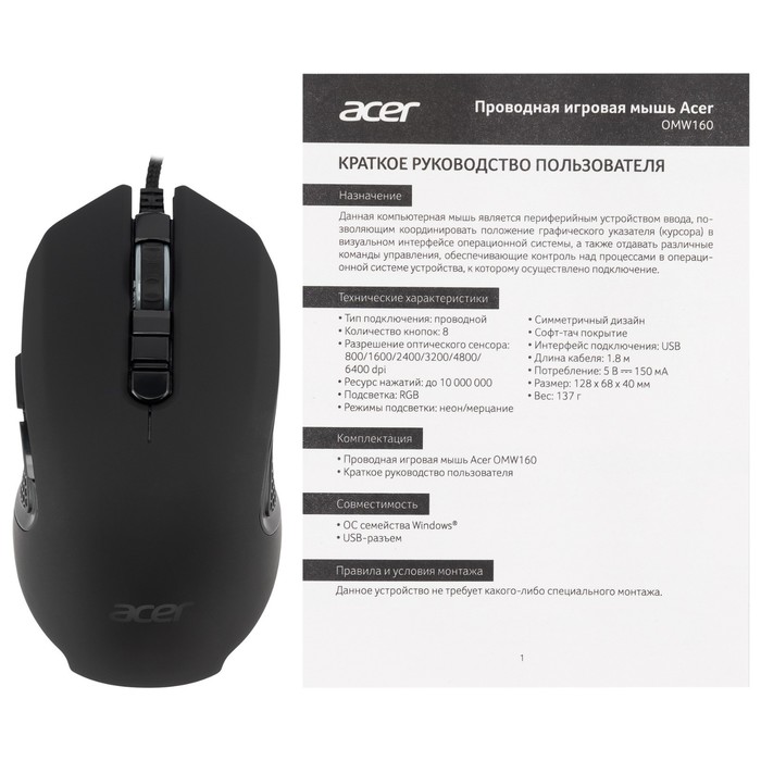 Acer OMW160 Black Optical Mouse (6400DPI) USB (8but)