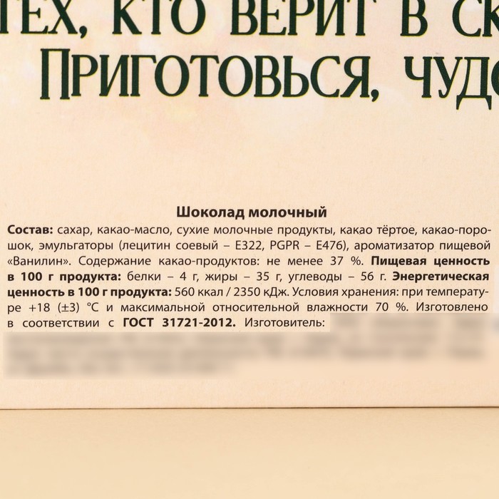 Composition: sugar, cocoa -butter, dry dairy products, cocoa grated, cocoa -powder, emulsifiers (soyge lecithin - E322, PGPR - E476), food flavor "Vanilin". 12 months