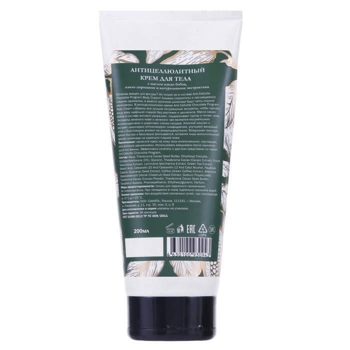 In the anti-cellulite cream, Anti-Cellite Chocolate Program Body Cream collects all the best natural extracts to make your skin perfectly smooth without stretch marks and cellulite. Caccao Bobs oil in the composition actively moisturizes, supports turgor and nourishes the skin. Extracts of green coffee and green tea are powerful antioxidants and strengthen the walls of blood vessels. Horse chestnut and kelp extract optimize lymphatic drainage, improve venous outflow and have a beneficial effect on microcirculation. The air texture of the cream is absorbed quickly and without a trace, leaving only a delicious aroma of chocolate on perfectly smooth skin.