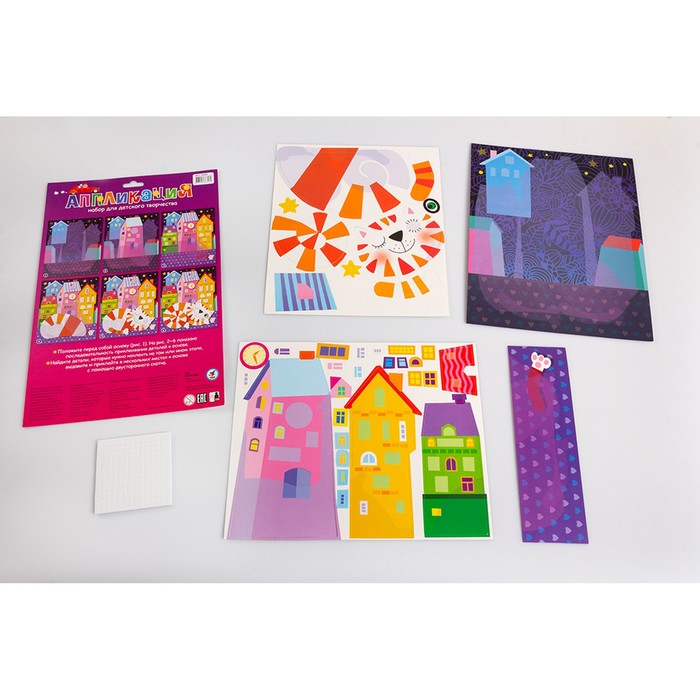 - Благодаря использованию плотного картона и двустороннего скотча элементы аппликации приподнимаются над основой, создавая причудливый и объёмный мир.