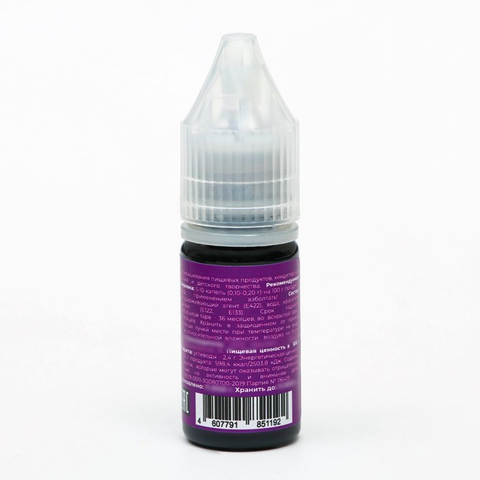 Recommended dosage: 5 - 10 drops of dye per 100 grams of product; 0.10 - 0.20 grams per 100 grams of product; 0.10 - 0.20 % of the mass of the product. Before use, shake!