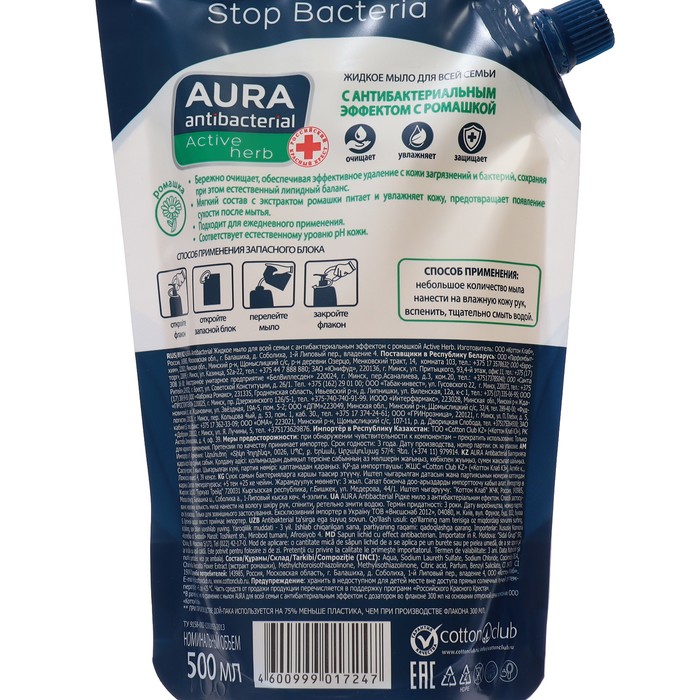 Description: AURA liquid soap with an antibacterial chamomile effect, 500 ml. Description: Aura liquid soap with an antibacterial effect, chamomile effectively cleanses the skin, does not injure and does not dry it.
