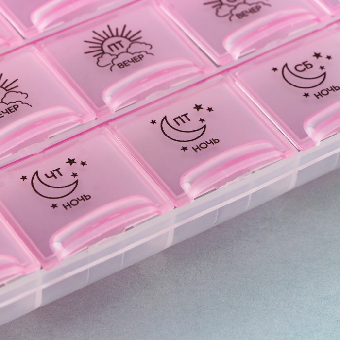 The compact organizer is made of safe plastic for use. Designed for storage of vitamins and tablets. A container for tablets for a day will serve as a compact first -aid kit, which can be taken to work, on vacation, on a business trip or for traveling a suburb for several days. The container organizer for tablets is suitable for active people who need to take medicines several times a day or for several days in a row outside the house.