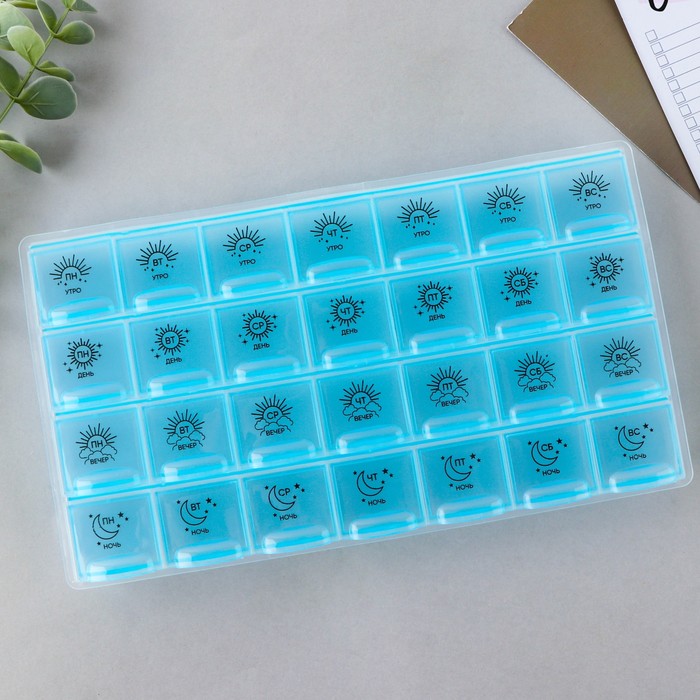 The compact organizer is made of safe plastic for use. Designed for storage of vitamins and tablets. A container for tablets for a day will serve as a compact first -aid kit, which can be taken to work, on vacation, on a business trip or for traveling a suburb for several days. The container organizer for tablets is suitable for active people who need to take medicines several times a day or for several days in a row outside the house.