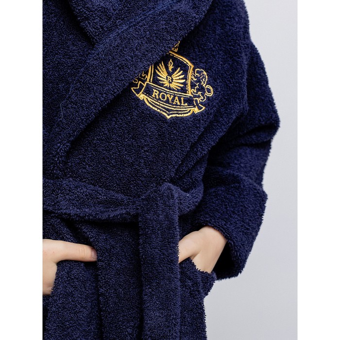 - Terry robe for a dark blue boy is made with a patch on his chest.