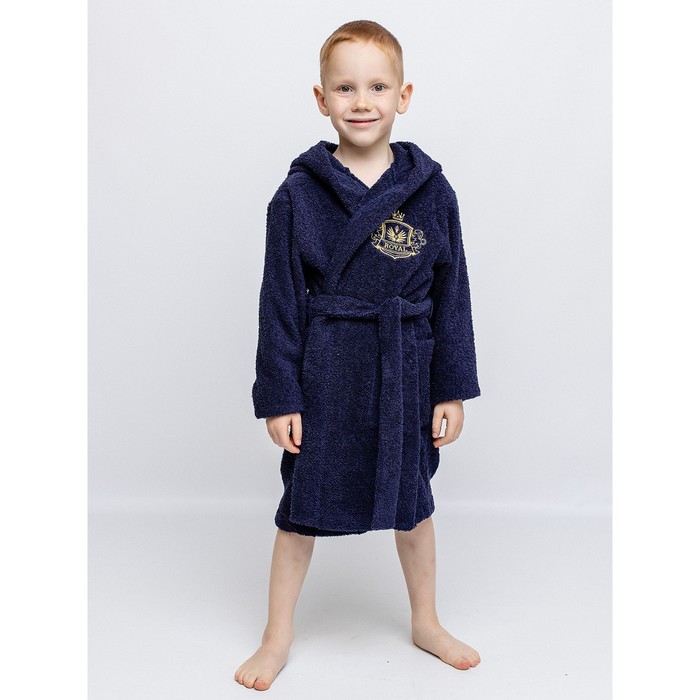 - Terry robe for a dark blue boy is made with a patch on his chest.