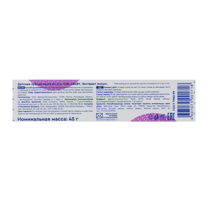 Special formula of toothpaste D.I.E.S. Kids Baby with linden extract is designed taking into account the characteristics of the first children's teeth. Active calcium helps the formation of strong enamel. A special complex with xylitol reduces the risk of caries. Linden extract helps to reduce itching and irritation when teeth teething.