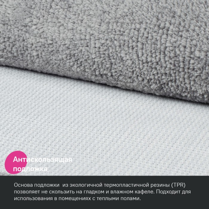 Gray mat with a dense high pile (2 cm) provides comfort and comfort in the bathroom. Its cut pile made of microfiber is pleasant to the touch and has excellent operational characteristics.