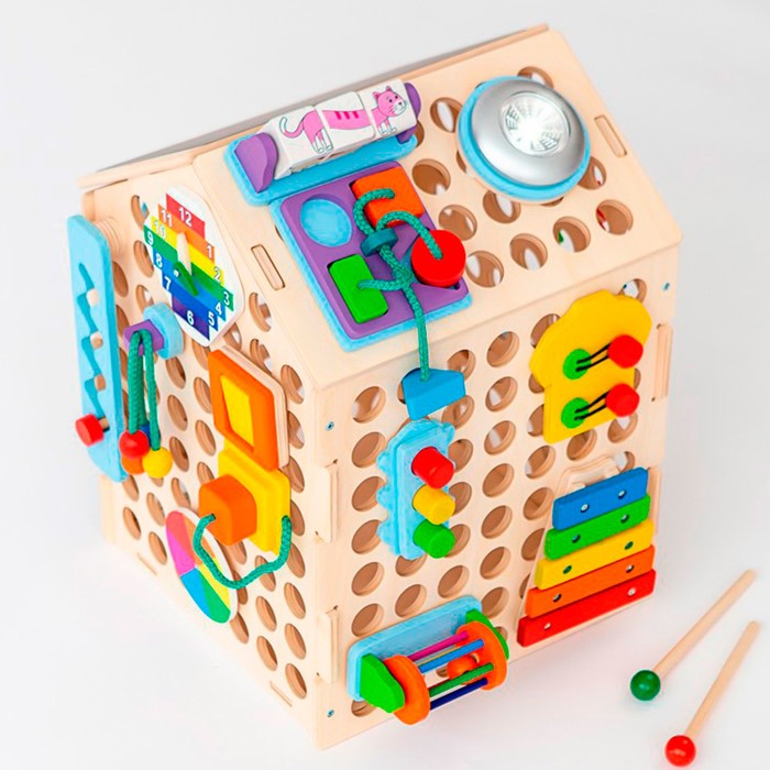 Bizid-designer is a toy whose elements can be easily removed and changed. The house itself can be disassembled and assembled. The Biziborn contains interesting elements: a xylophone, a switch, a socket, laces, gears and much more!