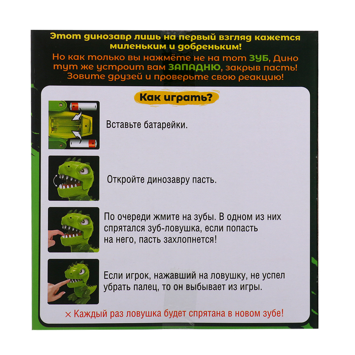 how to play- before the start of the game, insert the batteries and open the dinosaur to the mouth.