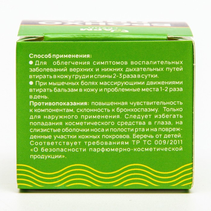 helps with laryngitis, pharyngitis, sinusitis and bronchitis. Promotes the removal of edema of the respiratory tract mucosa, and also stops asthma and allergies. The action of the balm is due to its vasodilating and antispasmodic effects.