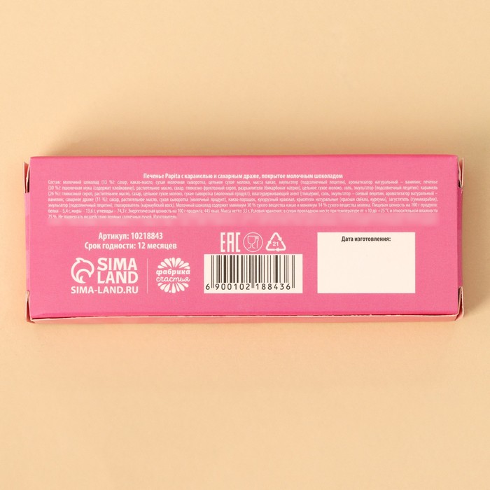 When placing an order, please request the current expiration dates for the manager's composition: milk chocolate (33 %): sugar, cocoa -maslo, dry milk serum, whole milk milk, cocoa mass, emulsifier (sunflower lecithin), natural flavor - vanillin - vanillin ; Cookies (30%): wheat flour (contains gluten), vegetable oil, sugar, glucose-fructose syrup, baking powder (sodium bicarbonate), whole milk powder, salt, emulsifier (sunflower lecithin); Caramel (26%): glucose syrup, vegetable oil, sugar, whole milk, dry serum (dairy product), moisture -holding agent (glycerin), salt, emulsifier - soy lecithin, natural flavor - vanillin; Sugar dragee (11%): sugar, vegetable oil, dry serum (dairy product), cocoa-powder, corn starch, natural dyes (red beets, turmeric), thickening (gummiarabic), emulsifier (sunflower lecithin), glazing worker (carnautian wax ).