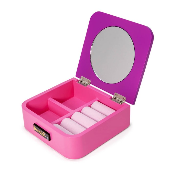 Features of- inside the box 3 compartments, one of which is velvety rollers for storing rings and earrings.