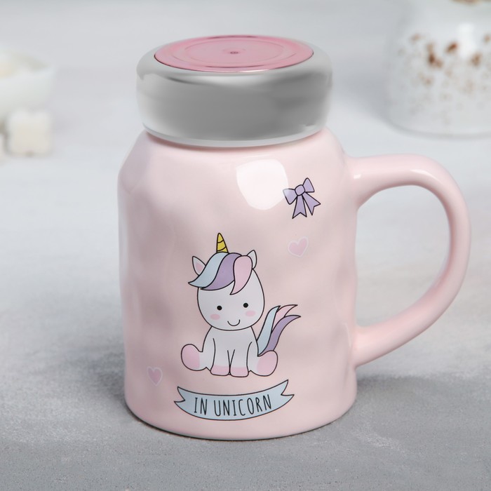 Ceramic "Rainbow" mug, 380 ml, with a plastic lid, pink color