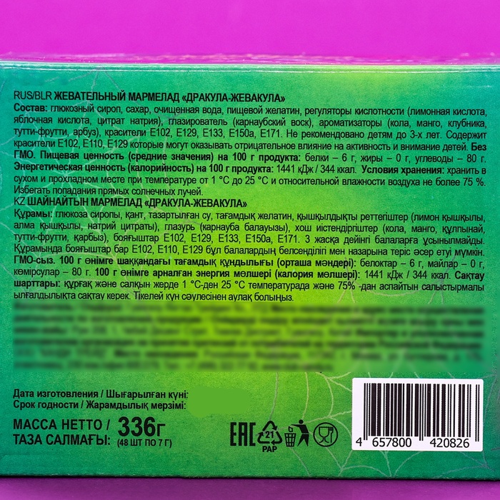 Each marmalade is presented in individual packaging, which allows you to easily take it with you. Fruit chewing marmalade will be the perfect treat for children's holidays, matinees and, of course, will add atmosphere of Halloween! Give your guests real magic and sweet moments of joy!