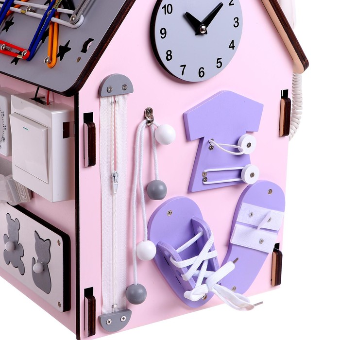 - from the back of the house there are also developing elements: Baby He learns how the clocks work, what Velcro and Lightning are, and it also practice tie the laces and fasten the buttons.