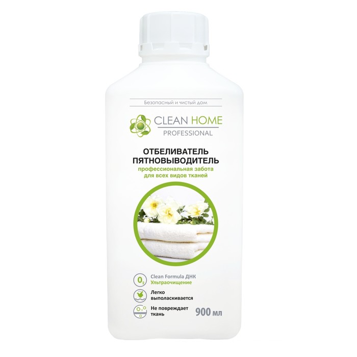 Clean Home White Exverter “Professional Care” removes spots from white and colored fabrics from tea, wine, coffee, greens, fruits, juices, blood, ink and other dyes. Saves the brightness of the fabric. Removes unpleasant odors. It works with any detergent for automatic and manual washing at a temperature of +30 ° C to +90 ° C. Clean Formula DNA is a truly necessary component that provides ultra -cutting - hydrogen peroxide, interacting with pollution, decays into active oxygen and water, allowing you to effectively cleanse the tissues. Thanks to this, the maximum whitening effect is achieved without exerting the effects of the color and fiber of the tissue. The composition of the product contains biodegradable components. It does not harm a person and nature, subject to use by purpose.