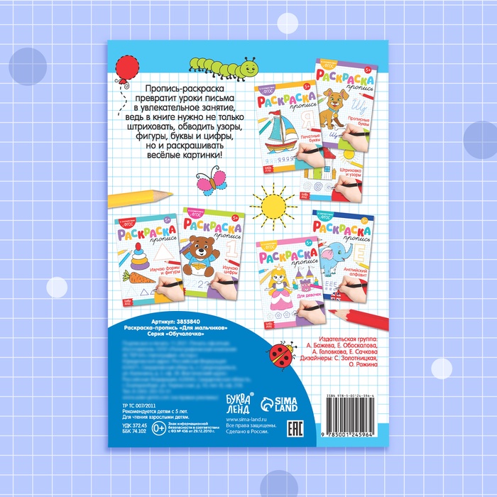 Color registers will turn the lessons of writing into a fascinating activity, because the book needs not only to stroke, circle patterns, figures, letters and numbers, but also painting funny pictures.