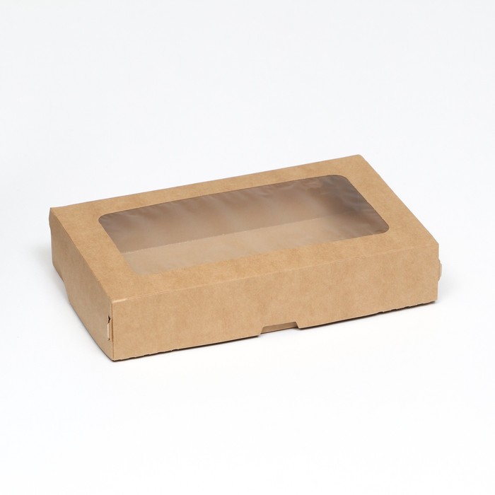 CRAFT CONTALITER WITH A DREASH OF DREAM is made of dense cardboard. The inner surface is covered with a thin protective film that prevents the material of the material. Conveniently and easily folds. This type of packaging is used for food for removal, convenient in the use of catering enterprises and the end consumer.
