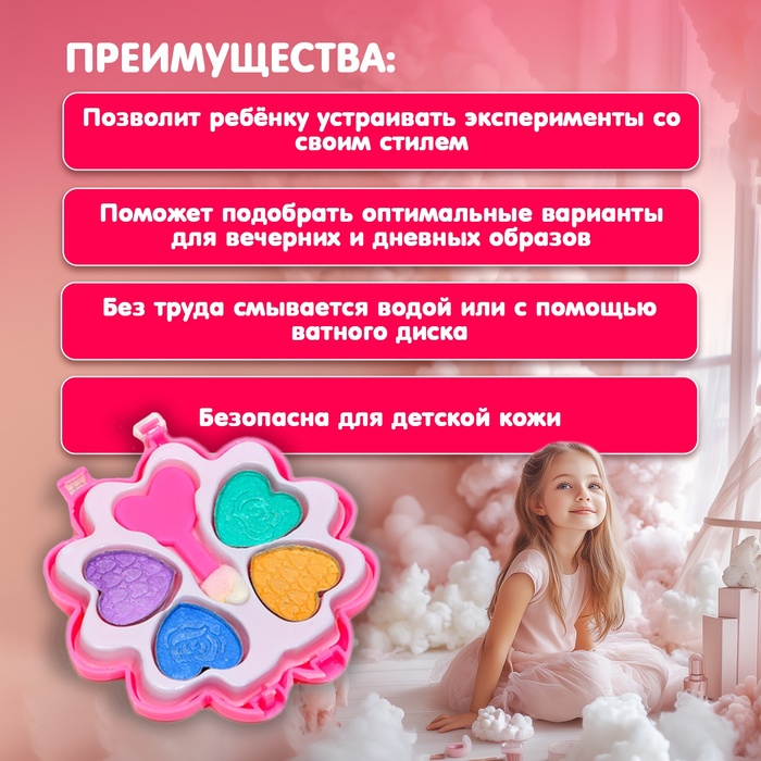 Children's cosmetics will allow the child to arrange experiments with his style. The set will help the girl choose the best options for evening and daytime images. Cosmetics can easily be washed off with water or with a cotton pad and is safe for children's skin.