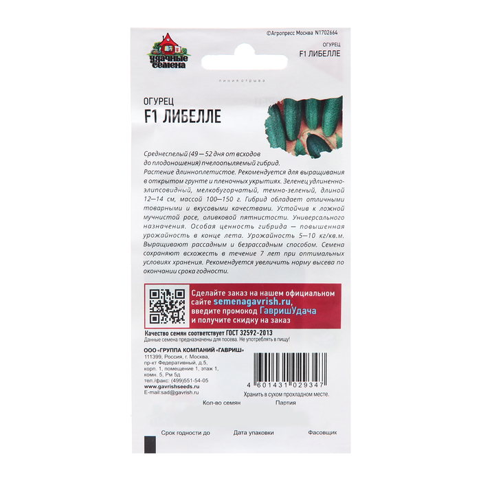 Cucumber seeds Libella F1. High-yielding medium-soldered bee-pushed hybrid, period from seedlings to fruiting 49-52 days. Recommended for open ground and film shelters. Productivity 8-10 kg/m2. Plants are predominantly female type of flowering. The fruits are spindle-shaped, small-bumpy, 10-13 cm long, weighing 100-140 g, dense, crispy. The taste is excellent, without bitterness. Great for fresh consumption, salting and pickling. The special value of the hybrid is increased productivity at the end of summer and resistance to the main diseases of the culture. Agricultural technology. Sowing seeds in the ground or on seedlings. The age of seedlings during landing is 20-30 days. Planting density in open ground 4-5 plants, in greenhouses 2-3 plants per 1 sq.m. In greenhouses, plants are tied to the trellis and formed in one stem. Side shoots are pinned over 2-3 sheets. Fruit collection must be carried regularly every 2-3 days.