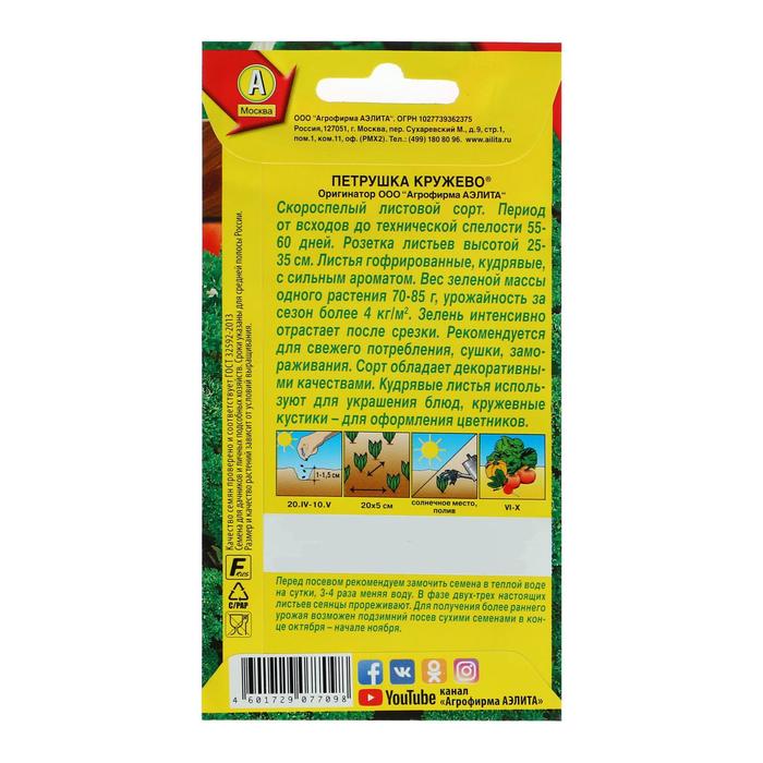 A afterbred variety, the period from seedlings to technical ripeness 55-60 days. The yield is high, more than 4 kg/m2 per season. Plants 25-27 cm high, the mass of one plant 70-90 g. The leaves are very corrugated, with a pleasant aroma, grow well after cutting. Parsley curly "lace" is rich in vitamins and useful minerals, normalizes metabolic processes in the body. It is used fresh, suitable for drying and freezing. It is very decorative, used to decorate various dishes.