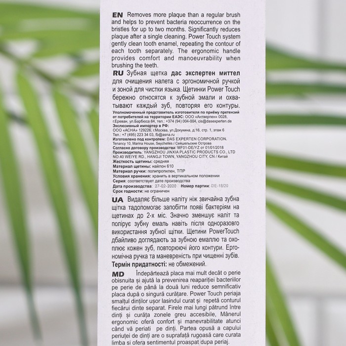 DAS Experten Mittel dental brush removes more plaque than an ordinary brush and helps to prevent the appearance of bacteria on the bristles in the period of up to two months. Significantly reduces plaque after single cleaning. Power Touch bristles are carefully treated with dental enamel and cover each tooth separately, repeating its contour.