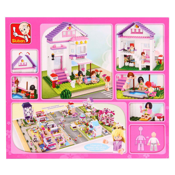 The functional features of thegaming set contains 291 parts and allows you to construct a luxurious two-story cottage with a balcony and a veranda, a pool with a lawn and 2 figures of girlfriends.