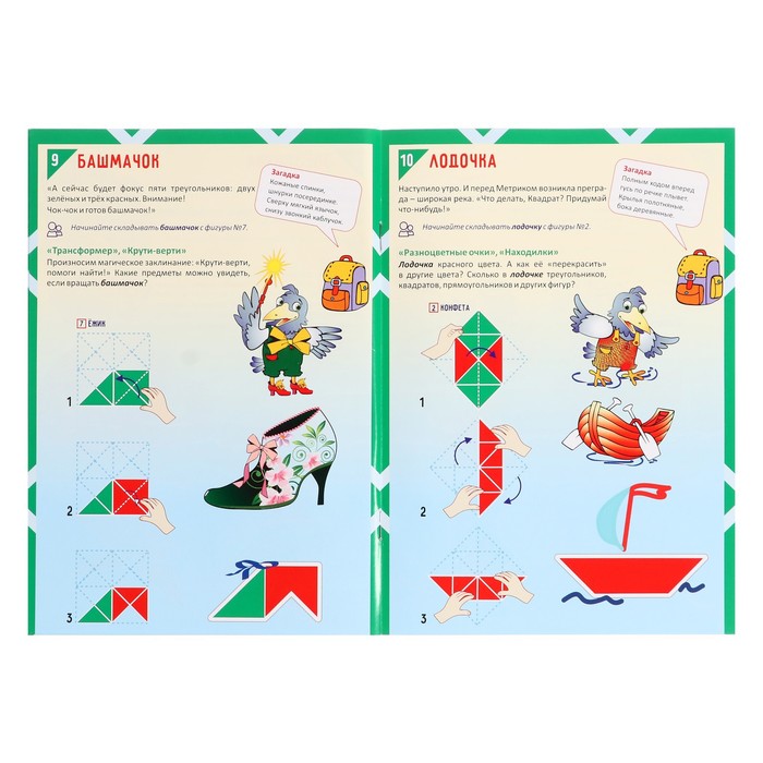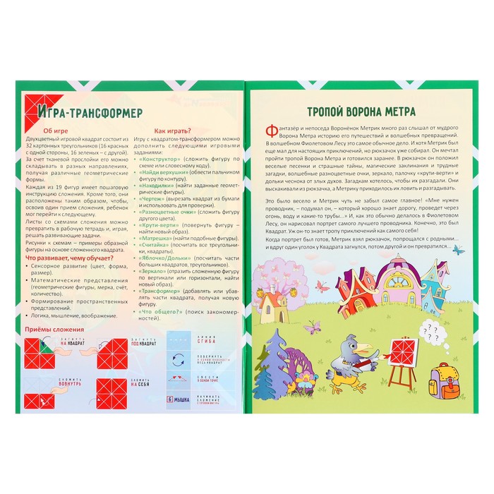 The developing game is a square field that includes 16 isosceles triangles with a size of 4.5 × 4.5 × 6 cm. They are pasted on a flexible fabric base at a distance of 3-5 mm from each other. On the one hand, the details of the red color, on the other - green. Fold the elements along the fold lines in different directions, make geometric and subject figures according to the scheme in the album or invent your own. Teach a child with voluminous design. Make cuts in certain places indicated in the application and create spatial figures. This didactic material introduces children to the basics of geometry, stereometry, modeling and score.