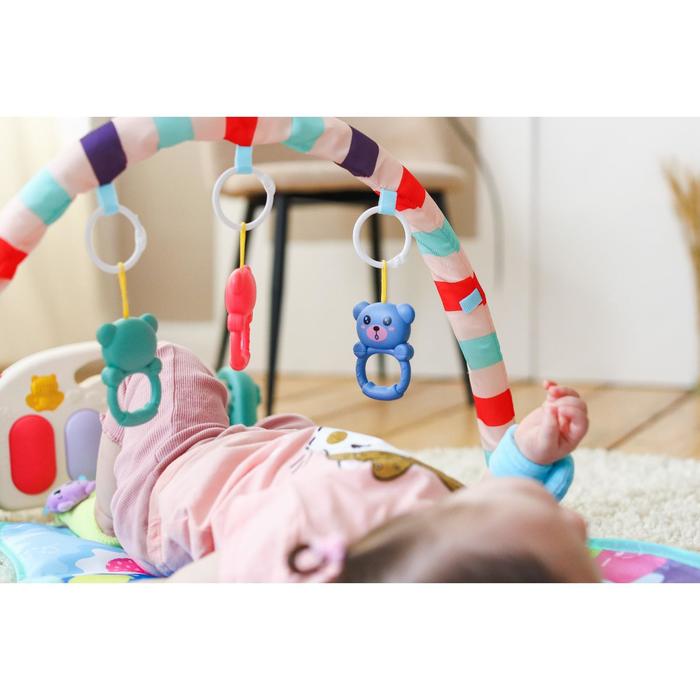 , first crumbs, lying on the back, it will simply be with interest to look bright toys on the arc, developing visual skills and the ability to phockering a look at the object. Over time, he will begin to reach for these attractive toys with handles and legs, improving the grave reflexi motor functions. Gradually, the baby will be able to step on the keys with pianinos and include music and light effects.