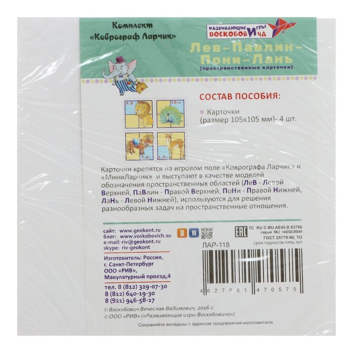 “Carpet“ Larchik ”is a large gaming complex for the use of developing benefits of Voskobovich. It includes many elements to conduct classes with preschool children and primary school students. Attach the field to the field and accompany your actions with an exciting fairy tale from the methodology. During classes, you can use not only the recommendations of the manufacturer, but also your own scenarios. For example, come up with an interesting story with seven dwarves, about the adventures of the Lap-Lapa elephant or conduct a graphic dictation. Turn classes with children into an exciting game!