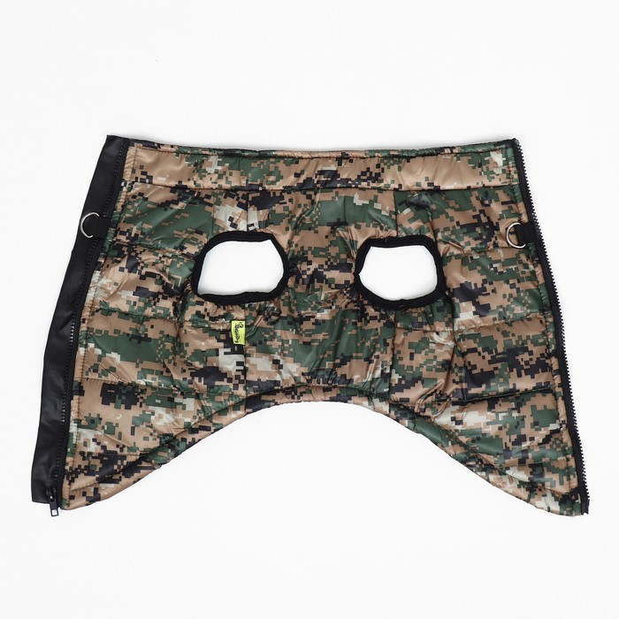 A warm jacket for dogs is a unique accessory for walking with your pet! A jacket is presented in a camouflage color. The world is located on the back of the pet that this allows you to easily put on and remove the jacket, there is also a ring for a leash/roulette for a convenient walk. The jacket filler is a synthetic winterizer. It will take small and medium breeds for dogs. It will be comfortable for your dog in rainy weather and she will definitely be satisfied!