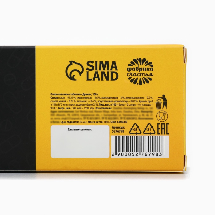 Composition: Sugar - 91.21 %, glucose syrup - 4.6 %, Maltodecostrin - 3 %, citric acid - 0.5 %, magnesium stearate - 0.25 %, vitamin C - 0.4 %, artificial Fragrance - 0.02 %, dyes - 0.01 %, E124, E102, E133, E110.
