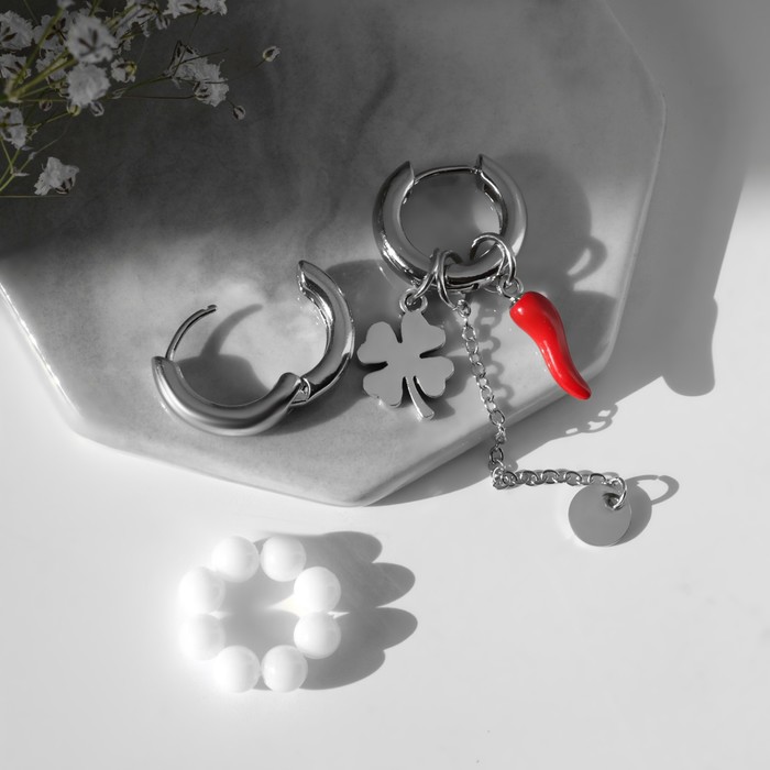 Earrings with the removable element "Transformer" Clover, white-red color in silver