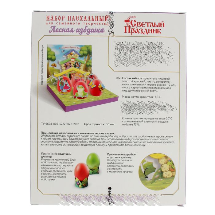 Composition: Dick gold red: salt, dyes: E171, E172, E122, E151, anti -settlement agent E555; Net mass - 1.3 g. A sheet with decorative details (paper) - 2 pcs., a sheet with stands for eggs (cardboard) - 1 pc., Bilateral tape foamed polyethylene, paper) - 1 pc.