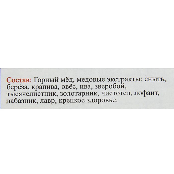 The product is used in the treatment of gout, rheumatism, arthritis, arthrosis and severe articular pain. The elixir is rich in vitamins, minerals and trace elements, has anti -inflammatory, analgesic and healing effect. It removes salts from the joints, helps to return their mobility, improves metabolic processes, restores cartilage tissue. Method of application: take inward one teaspoon per day, washed down with a large amount of water. Can be diluted in a glass of water (50 ml). Ingredients: mountain honey, honey extracts: Done, birch, nettles, oats, willow, St. John's wort, yarrow, goldfin, celandine, lofant, labaznik, laurel. The course of taking the drug is 21 days. Shelf life is 2 years.