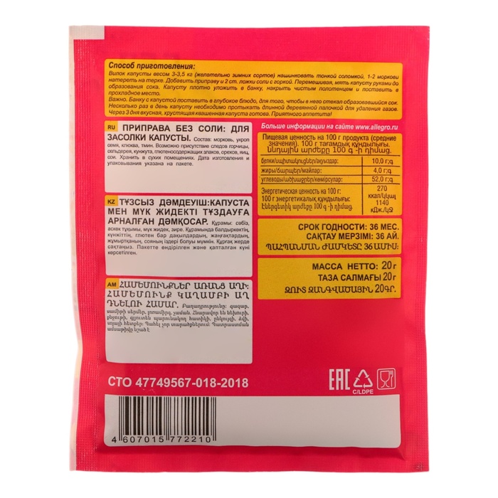 The product is packaged in a convenient package weighing 20 grams, which allows you to use it for salting a small amount of cabbage. The crushed form of release allows you to easily and evenly distribute the seasoning for cabbage, providing a rich taste and aroma.