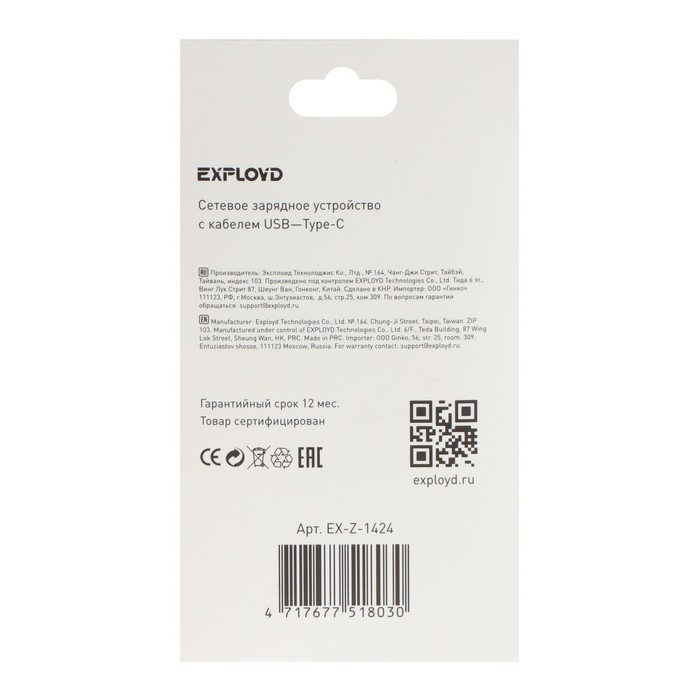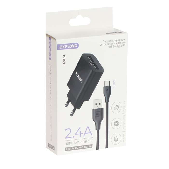 EXPLOYD EX-Z-1424, 2 USB, 2.4 A, Type-C cable, 1 m, black