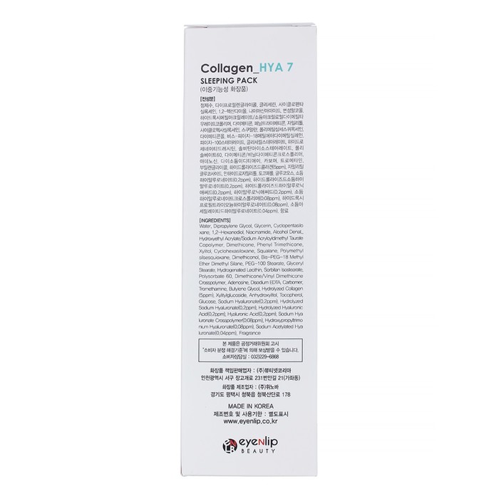 The Eyenlip Collagen_hya 7 Sleeping Pack Night face contains a collagen extracted from fish and 7 types of hyaluronic acid, fills the skin with the necessary nutrients and moisturizing components, improves the complexion and strengthens the oval. Helps to eliminate dryness, peeling and feelings of tightness, saturates the skin with moisture, softens and reduces the severity of wrinkles.