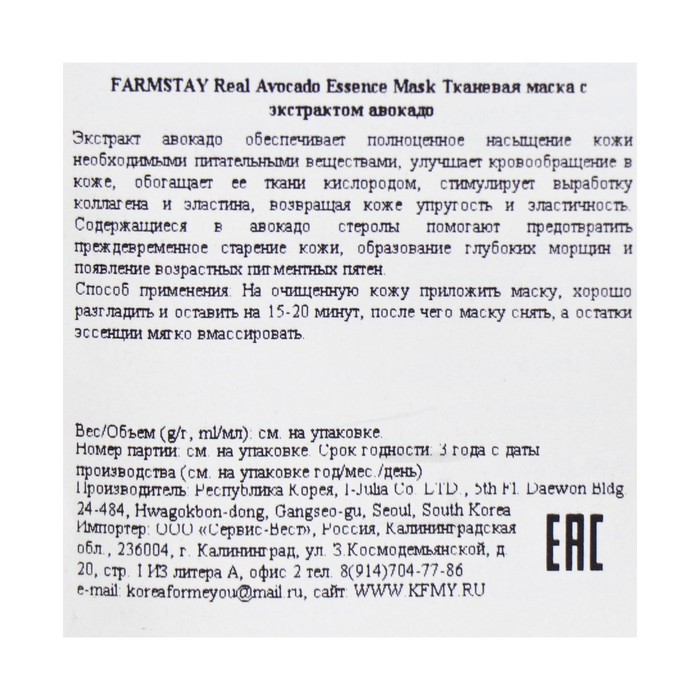 Farmstay fabric face mask, with avocado extract, 23 ml