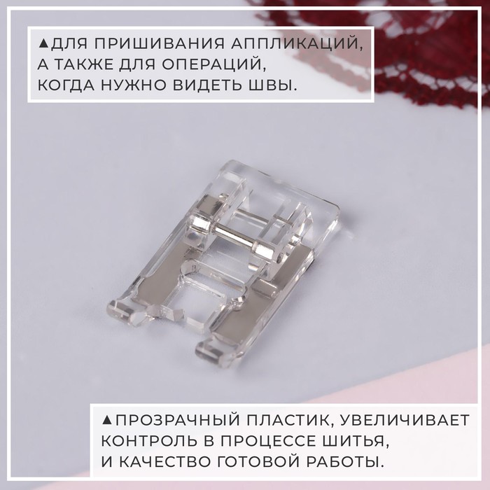 The foot is designed to sew applications, as well as for operations when you need to see the seams. Thanks to transparent plastic, control in the process of sewing and the quality of the finished work increases.